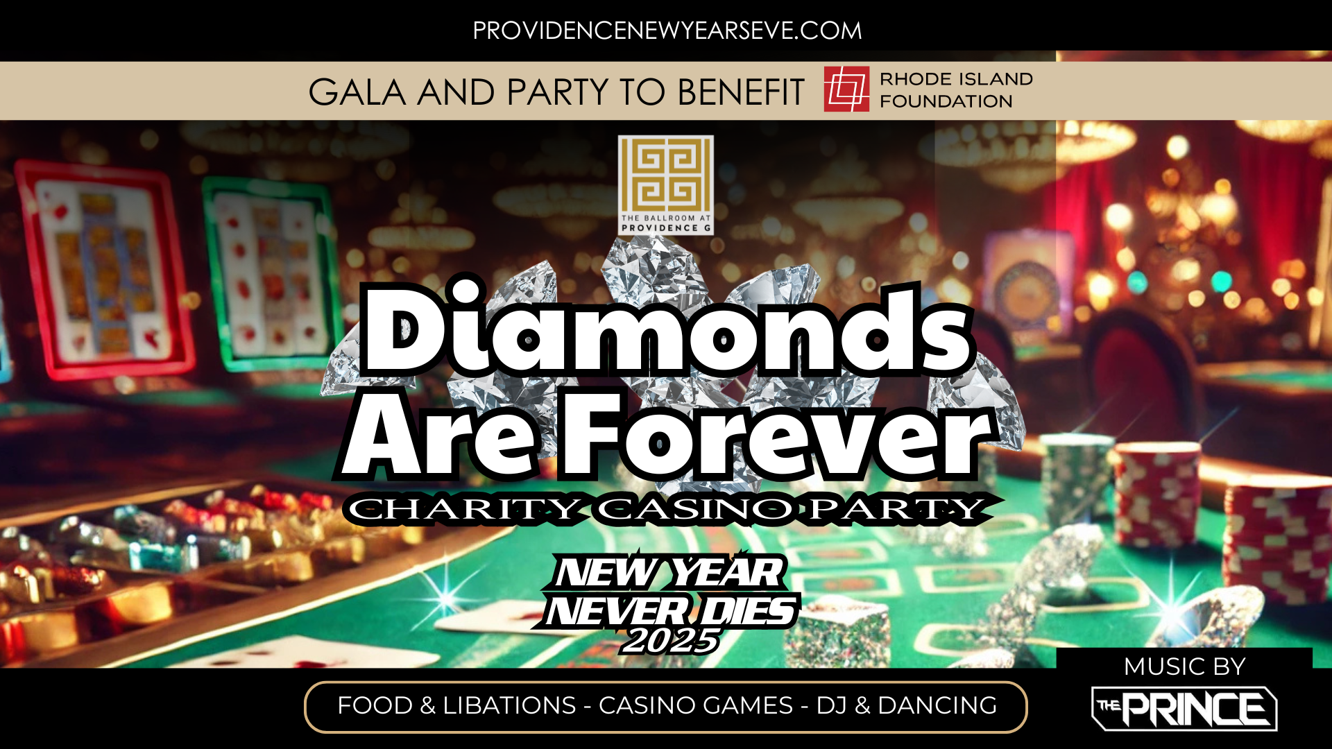 Guests will enjoy the ultimate NYE experience including a red-carpet arrival, cocktail hour, stationary dinner selections, live entertainment by the Dave Macklin band, dancing, a midnight countdown, and receive “free money” to cash in for chips to play casino games for the chance to win prizes and to raise money towards Rhode Island Foundation’s Healthy & Safe Providence Fund. A limited number of sponsor tables are available. All-Access tickets to the “Casino Royale” Gala also include entry to the “Diamonds Are Forever” Party. Learn more about the “Casino Royale” Gala here: https://ghospitality.net/event/new-year-never-dies-a-charity-casino-gala-2025/