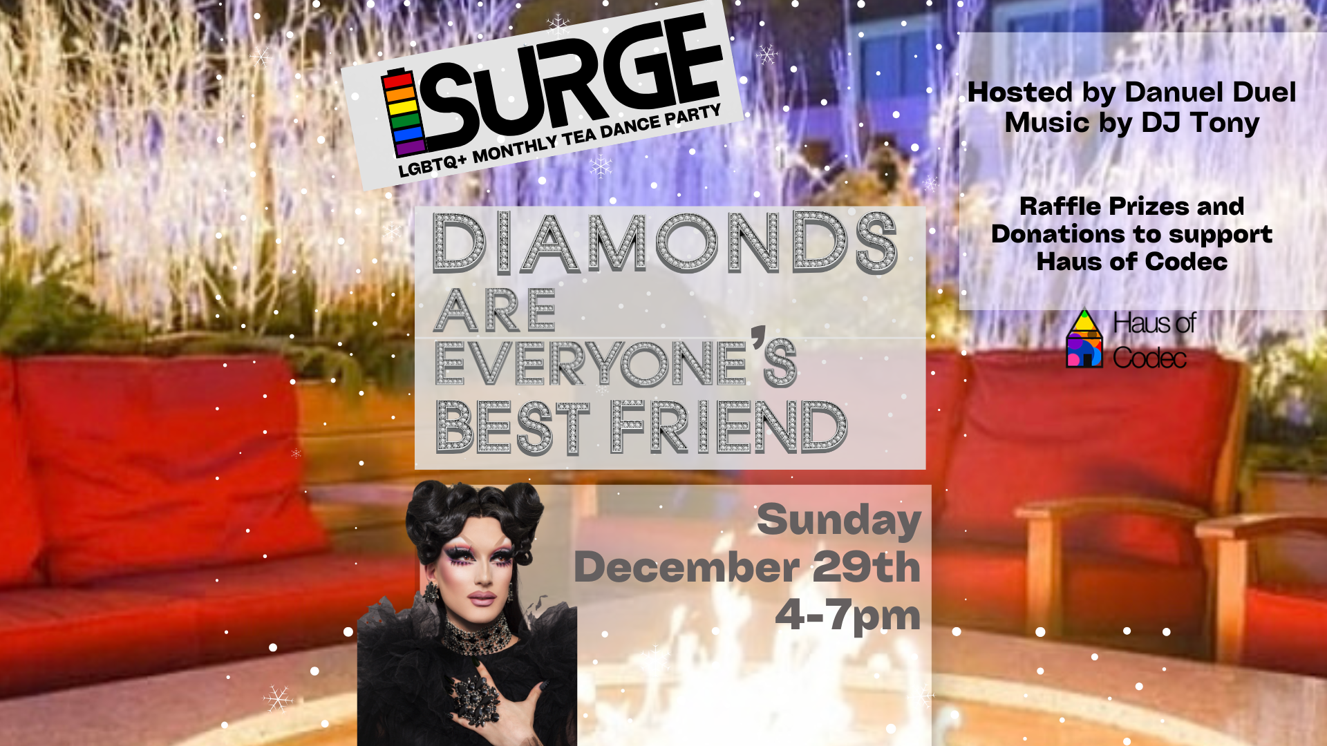 On Sunday, December 29, SURGE returns to the Rooftop with its December theme “Diamonds are Everyone’s Best Friend” LGBTQ+ tea dance from 4-7pm.